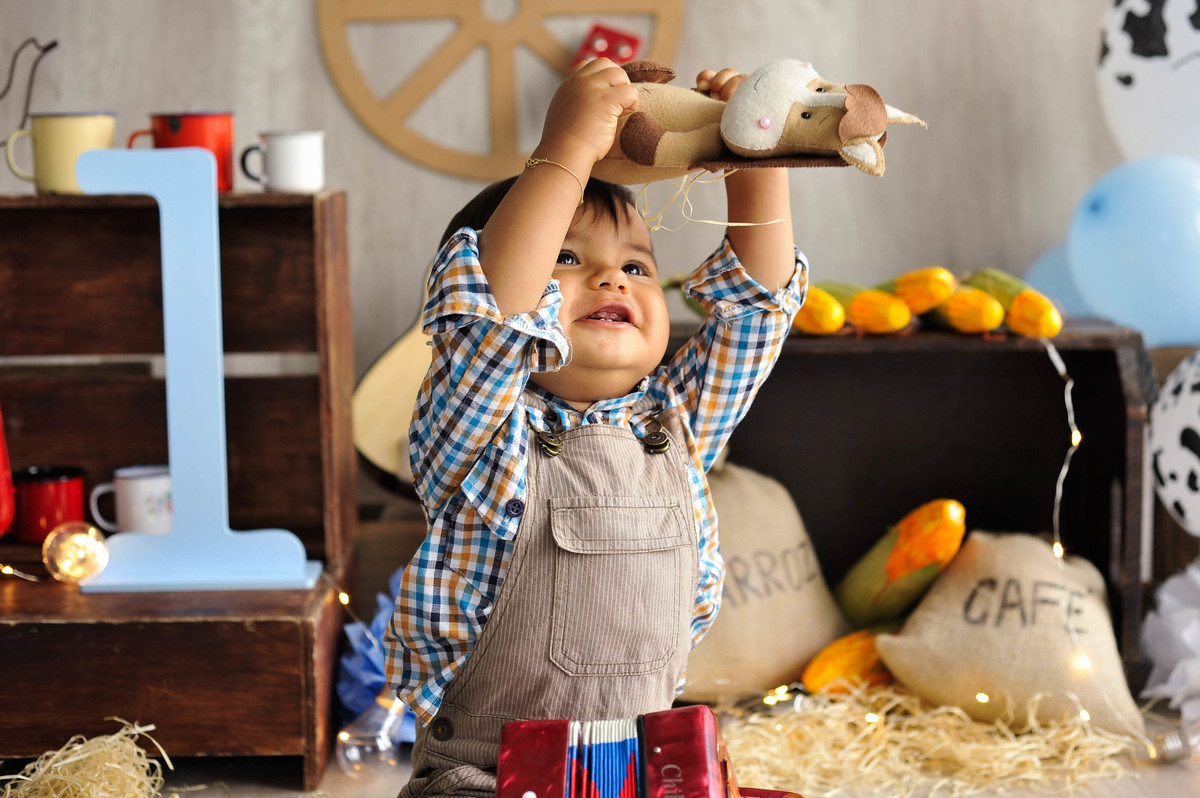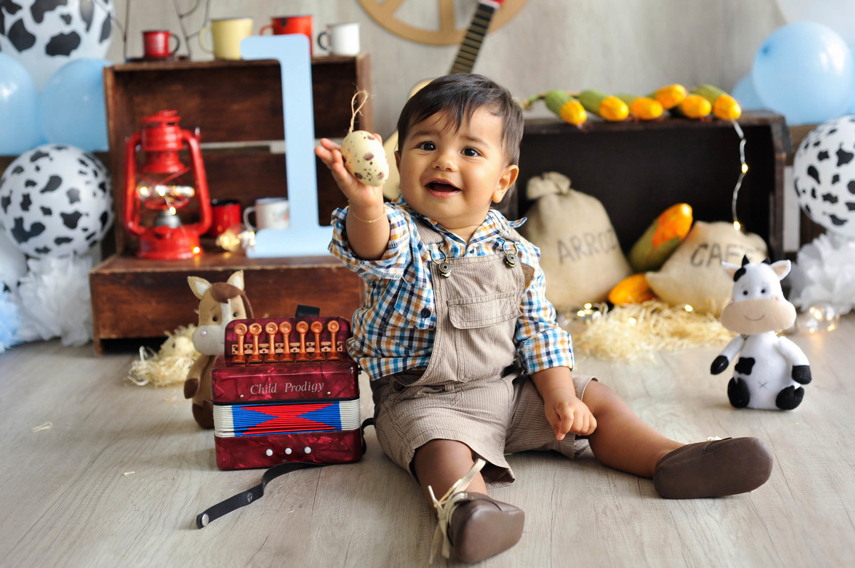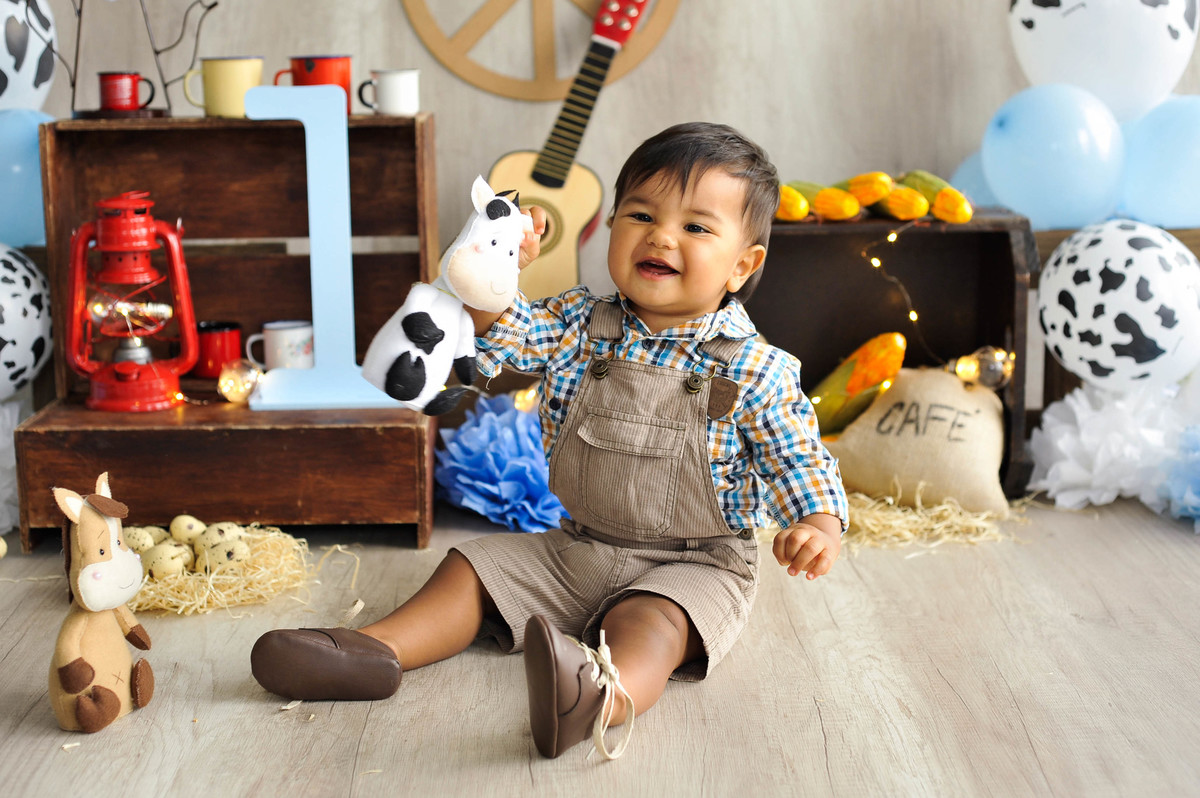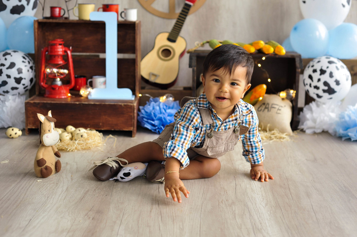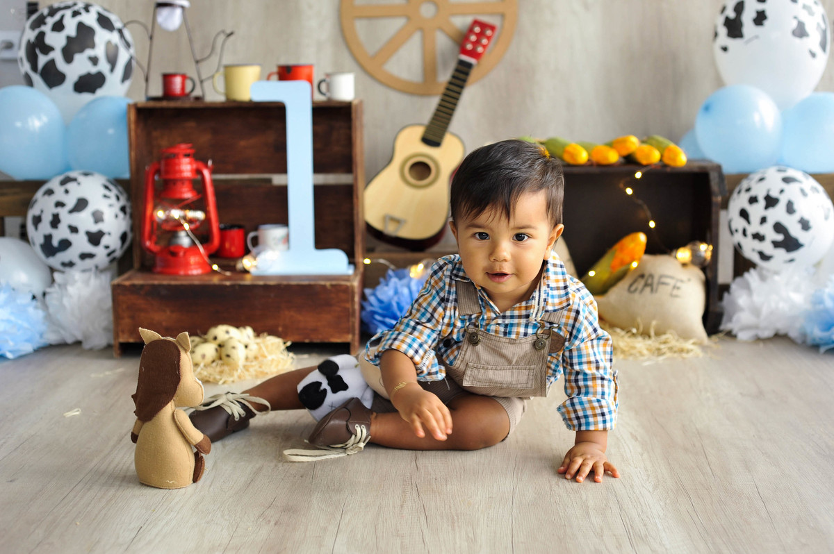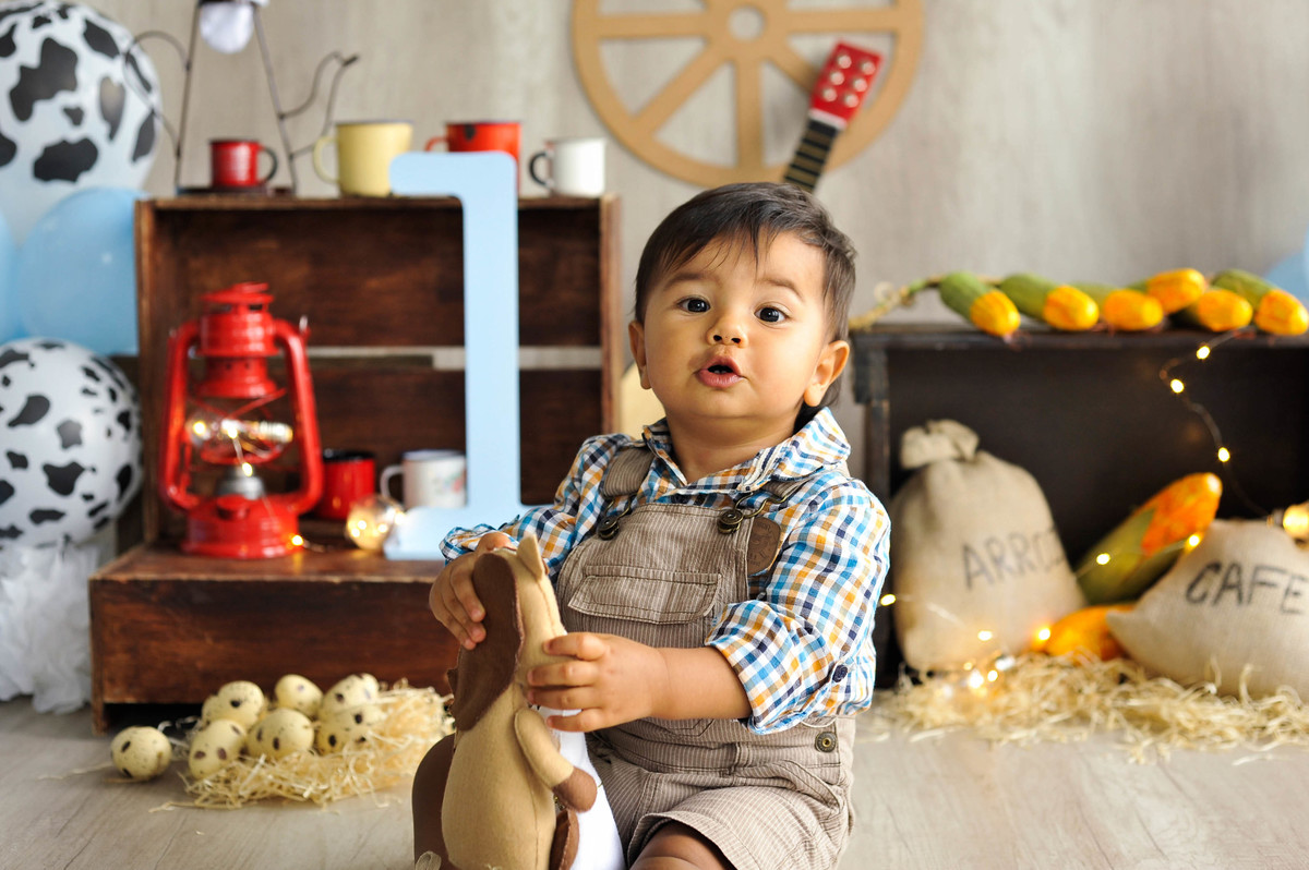 fotografia infantil fazendinha ensaio fotográfico aniversário 1 ano parabéns criança menino boy photografy cenário bebê temático sitio chacara vaca cavalo